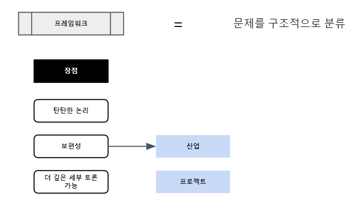 프레임워크의 장점은 탄탄한 논리, 보편성, 더 깊은 세부 토론 등이 있다.