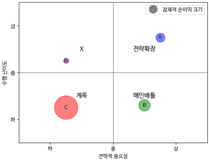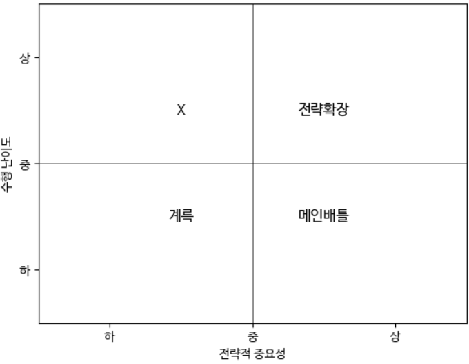 2차원 그래프를 사용해서 분석해 보자. X축에는 전략적 중요성을, Y 축에는 수행 난이도를 두고 사분면으로 나누면 이렇게 분류할 수 있다: