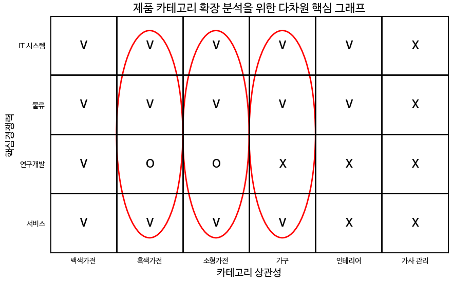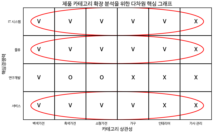 2. 새로운 카테고리와 특정 핵심 경쟁력이 일치할 경우 'V', 일치하지 않을 경우 'X', 불확실한 경우 'O'로 및 잘 매치되는 항목 표시