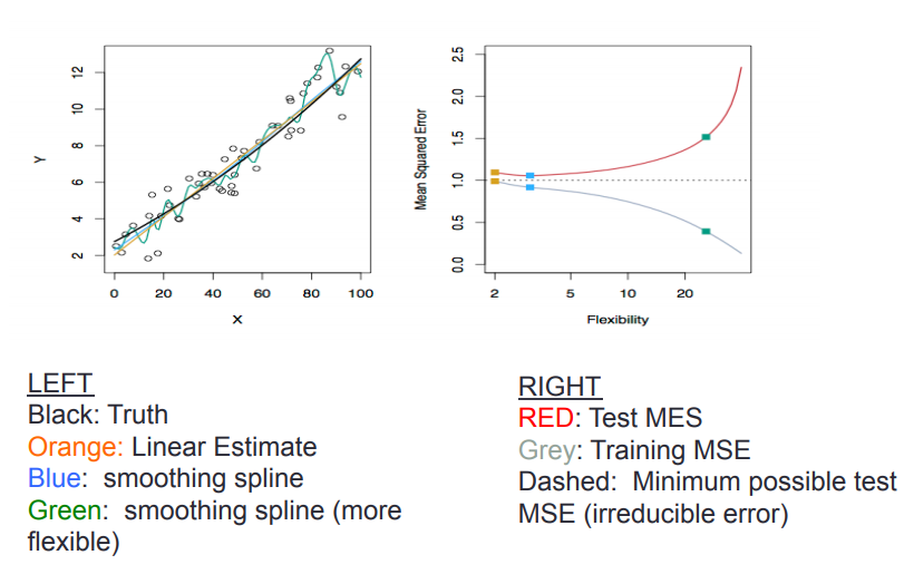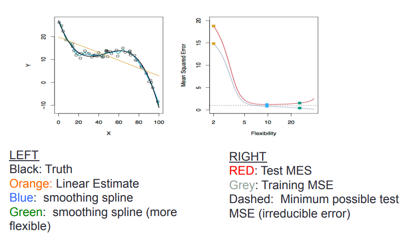그러나 사실, Test MSE는 간단한 접근(선형 회귀 같은) 보다 더 유연한 모델에서 높게 나타납니다.