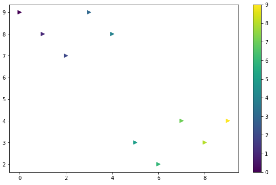plt.scatter(t,y, s = 50, c = colormap, marker='>') # s옵션은 마커의 크기