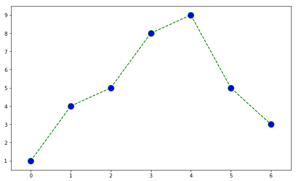 plt.plot(t, y, color='green', linestyle='dashed', marker='o') # 마킹 지정