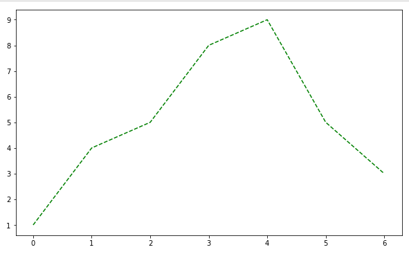 plt.plot(t, y, color='green', linestyle='dashed') # 선 스타일 지정