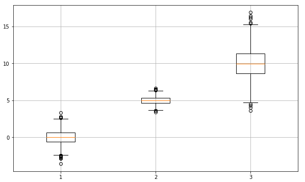 plt.boxplot((s1, s2, s3))
