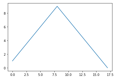 plt.plot([1,2,3,4,5,6,7,8,9,8,7,6,5,4,3,2,1,0])