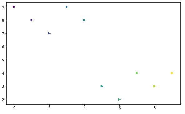 plt.scatter(t,y, s = 50, c = colormap, marker='>') # s옵션은 마커의 크기