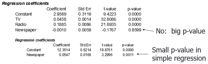 Simple regression에서는 Newspapers에 의해 설명되지만 Multiple regression에서는 TV와 Radio로 설명된다.