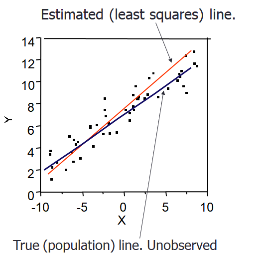 샘플로부터 얻어진 회귀 직선은 실제 모집단의 회귀 직선이 아닙니다.
