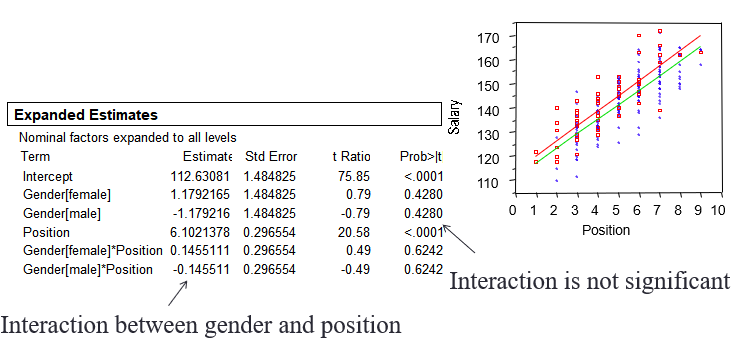 만약 직선이 평행하지 않다면 승진은 여자와 남자의 급여가 다르게끔 영향을 미칩니다.