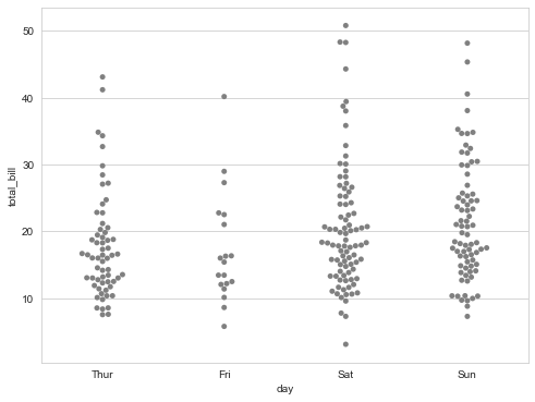 sns.swarmplot(x="day", y="total_bill", data=tips, color=".5")