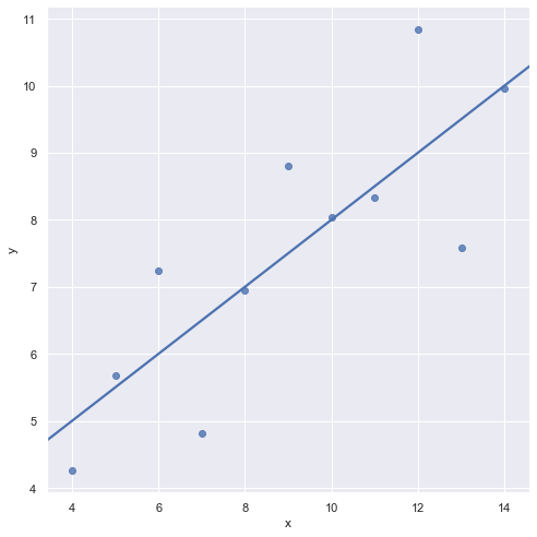 sns.lmplot(x="x", y="y", data=anscombe.query("dataset == 'I'"),