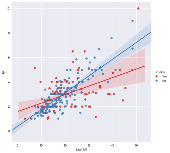 sns.lmplot(x="total_bill", y="tip", hue="smoker", data=tips, palette="Set1", size=7)