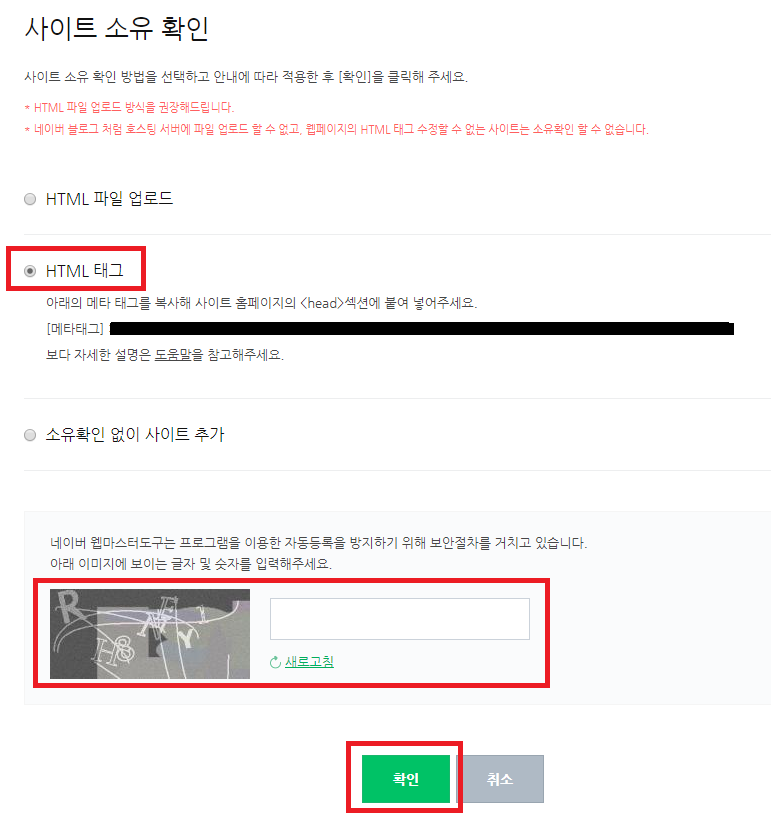 다시 네이버 웹마스터로 돌아가 보안 번호와 확인을 눌러줍니다.