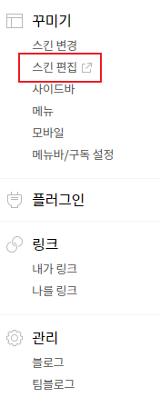 티스토리 관리 창 중 꾸미기에서 스킨 편집을 클릭합니다.