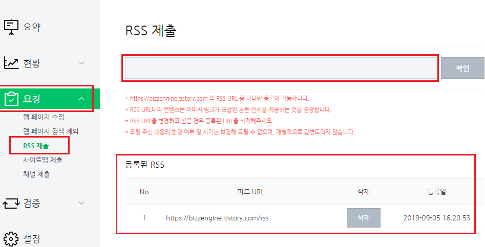 왼쪽 요청란에서 RSS제출을 클릭한 후 입력란에 본인의 주소 뒤에 /rss를 추가하고 확인을 눌러줍니다.
