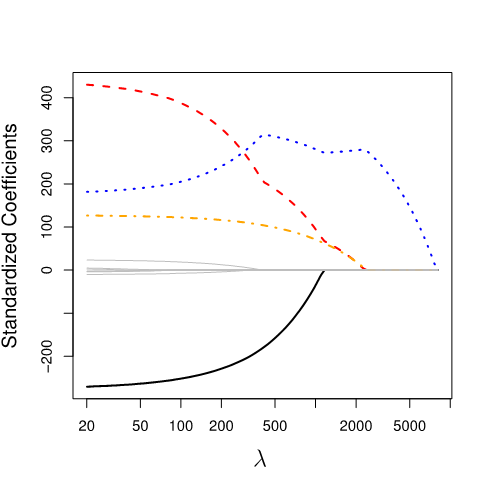 $\lambda$가 증가함에 따라, standardized coefficients는 0까지 감소합니다.