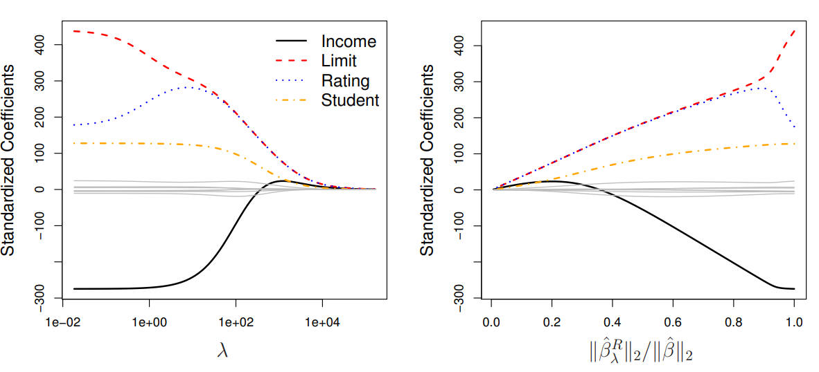 그림1에서 y축의 Standardized coefficients는 standardized predictors를 사용하여 릿지 회귀를 수행한 후의 coefficient estimates 결과입니다.