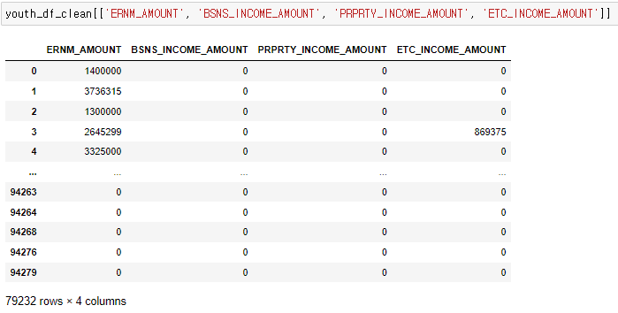 모두 소득 금액과 관련된 변수입니다. 일자리 청년통장 선발에 중요한 변수가 될 수도 있으므로 삭제해서는 안됩니다.